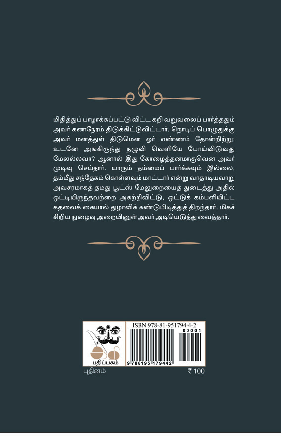 மிதித்துப் பாழாக்கப்பட்டு விட்ட கறி வறுவலைப் பார்த்ததும் அவர் கணநேரம் திடுக்கிட்டுவிட்டார். நொடிப் பொழுதுக்கு அவர் மனத்துள் திடுமென ஓர் எண்ணம் தோன்றிற்று: உடனே அங்கிருந்து நழுவி வெளியே போய்விடுவது மேலல்லவா? ஆனால் இது கோழைத்தனமாகுவென அவர் முடிவு செய்தார். யாரும் தம்மைப் பார்க்கவும் இல்லை, தம்மீது சந்தேகம் கொள்ளவும் மாட்டார் என்று வாதாடியவாறு அவசரமாகத் தமது பூட்ஸ் மேலுறையைத் துடைத்து அதில் ஒட்டியிருந்தவற்றை அகற்றிவிட்டு, ஒட்டுக் கம்பளியிட்ட கதவைக் கையால் துழாவிக் கண்டுபிடித்துத் திறந்தார். மிகச் சிறிய நுழைவு அறையினுள் அவர் அடியெடுத்து வைத்தார்.