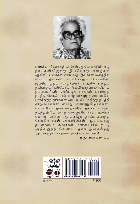 பணக்காரர்களாகத் தாங்கள் ஆதிகாலத்தில் அடி நாட்களில் இருந்து இப்போது ஏழைகள் ஆகிவிட்டவர்கள் என்பதை இவர்கள் மனத்தில் வைப்பதில்லை. எப்போதும் போலவே இப்பொழுதும் வாழ்க்கைத் தரத்தில் சிறிதும் நலியாதவர்கள் போல் மெலியாதவர்கள் போல் நடப்பவர்கள். அப்படித் தாங்கள் பாவித்து நடந்து கொண்டால் மற்றவர்களும் அப்படியே பாவித்துத் தங்களை அப்படியே மதித்து நடத்தி விடுவார்கள் என்று எண்ணுகிறார்கள். எப்படியோ தரம் மாறாமலே தங்கள் வாழ்வு நடந்துவிடும் என்று எண்ணுகிறார்கள்: உலகை ஏமாற்ற எண்ணி ஆரம்பித்துத் தாமே ஏமாந்து போகிறார்கள் அறிவிலிகள்! ஒவ்வொரு தடவையும் அவர்கள் மண்டையில் தட்டி அறிவுறுத்த வேண்டியதாக இருக்கிறது அவர்களுடைய இன்றைய நிலைமையை! – க.நா.சுப்ரமண்யன்
