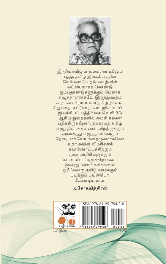 இந்தியாவிலும் உலக அரங்கிலும் புதுத் தமிழ் இலக்கியத்தின் மேன்மையே தன் வாழ்வின் லட்சியமாகக் கொண்டு ஐம்பதாண்டுகளுக்கும் மேலாக எழுத்தாளராகவே இருந்துவரும் க.நா.சுப்பிமண்யம் தமிழ் நாவல், சிறுகதை, கட்டுரை, மொழிபெயர்ப்பு, இலக்கியப் பத்திரிகை வெளியீடு ஆகிய துறைகளில் மைல் கல்கள் பதித்திருக்கிறார். தற்காலத் தமிழ் எழுத்தில் அதனைப் புரிந்திருக்கும் அனைத்து எழுத்தாளர்களும் நேரடியாகவோ மறைமுகமாகவோ க.நா.சுவின் விமரிசனக் கண்ணோட்டத்திற்கும் முன் மாதிரிகளுக்கும் கடமைப்பட்டிருக்கிறார்கள். எழுபத்தி மூன்றாவது வயதிலும் அயராது உழைக்க வேண்டியுள்ள இவரது ‘விமரிசனக்கலை’ ஒவ்வொரு தமிழ் வாசகரும் படித்துப் பயன்பெற வேண்டிய நூல்.